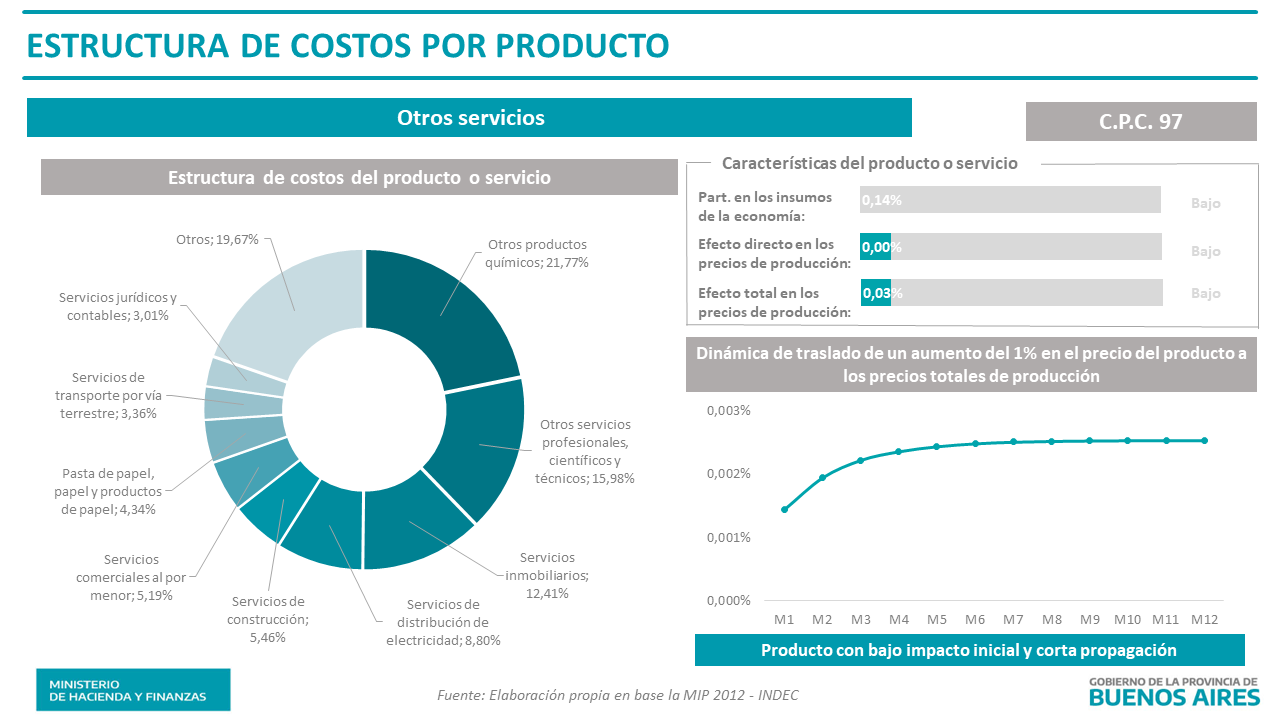 Análisis realizado a partir de la matriz insumo producto nacional para el año 2012, con productos/servicios a dos dígitos de la Clasificación de Productos Central (CPC). Se presenta la estructura de costos de cada producto/servicio y el efecto multiplicar directo y total de un aumento en un 1% en el precio de cada producto/servicio sobre los precios totales de la economía. Ver nota metodológica.