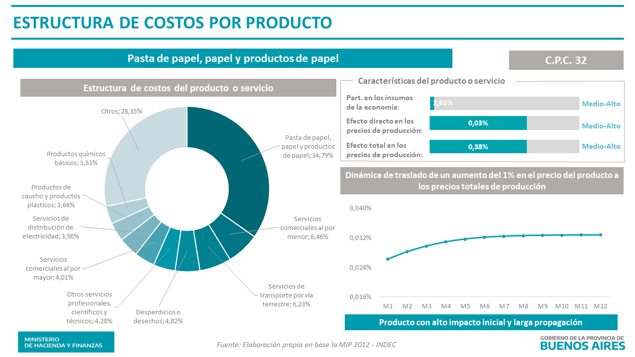 Análisis realizado a partir de la matriz insumo producto nacional para el año 2012, con productos/servicios a dos dígitos de la Clasificación de Productos Central (CPC). Se presenta la estructura de costos de cada producto/servicio y el efecto multiplicar directo y total de un aumento en un 1% en el precio de cada producto/servicio sobre los precios totales de la economía. Ver nota metodológica.