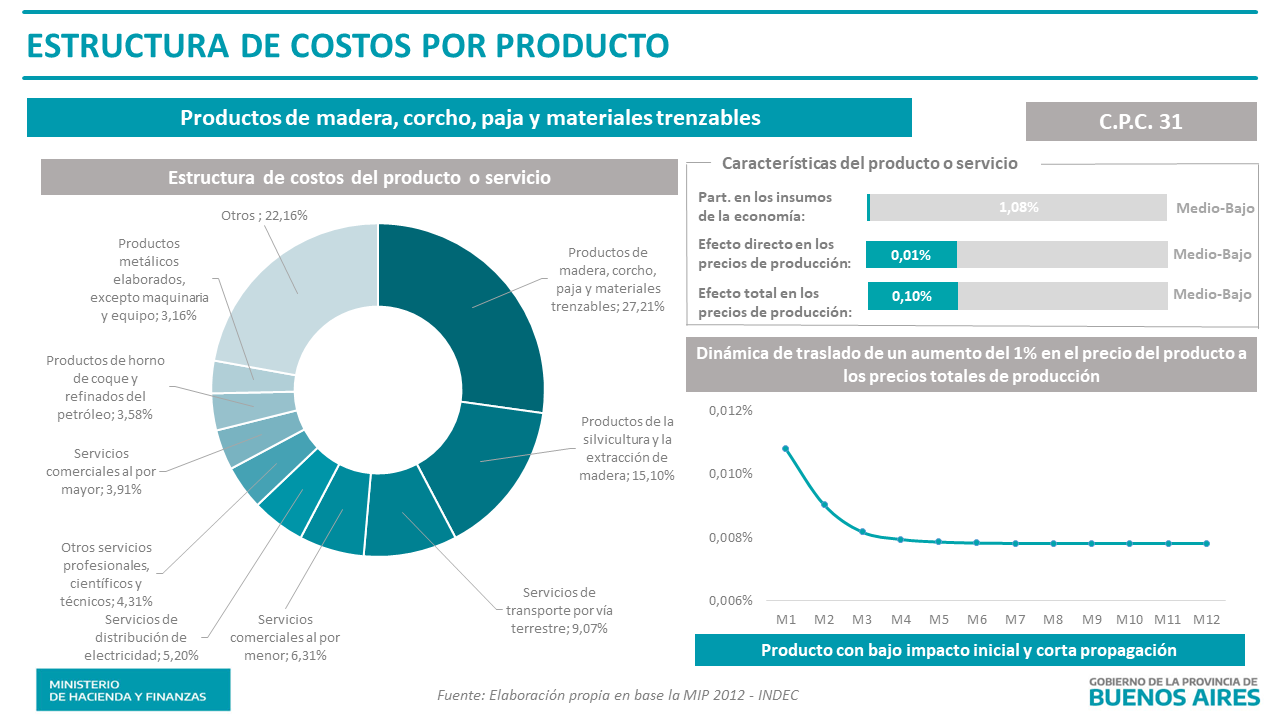 Análisis realizado a partir de la matriz insumo producto nacional para el año 2012, con productos/servicios a dos dígitos de la Clasificación de Productos Central (CPC). Se presenta la estructura de costos de cada producto/servicio y el efecto multiplicar directo y total de un aumento en un 1% en el precio de cada producto/servicio sobre los precios totales de la economía. Ver nota metodológica.