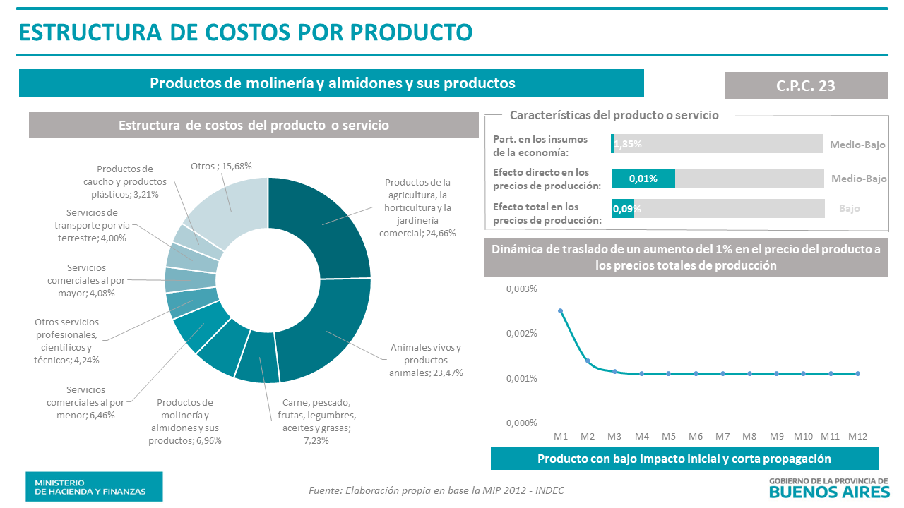 Análisis realizado a partir de la matriz insumo producto nacional para el año 2012, con productos/servicios a dos dígitos de la Clasificación de Productos Central (CPC). Se presenta la estructura de costos de cada producto/servicio y el efecto multiplicar directo y total de un aumento en un 1% en el precio de cada producto/servicio sobre los precios totales de la economía. Ver nota metodológica.