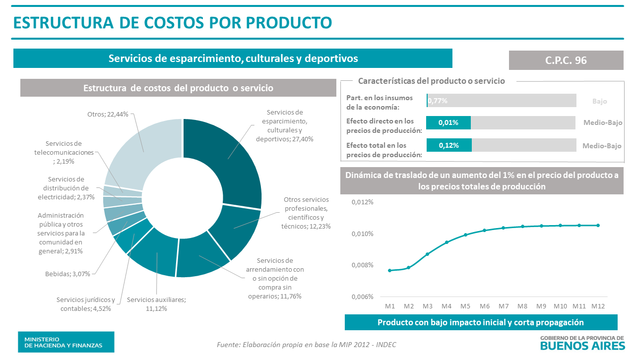 Análisis realizado a partir de la matriz insumo producto nacional para el año 2012, con productos/servicios a dos dígitos de la Clasificación de Productos Central (CPC). Se presenta la estructura de costos de cada producto/servicio y el efecto multiplicar directo y total de un aumento en un 1% en el precio de cada producto/servicio sobre los precios totales de la economía. Ver nota metodológica.