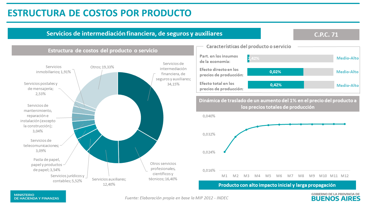Análisis realizado a partir de la matriz insumo producto nacional para el año 2012, con productos/servicios a dos dígitos de la Clasificación de Productos Central (CPC). Se presenta la estructura de costos de cada producto/servicio y el efecto multiplicar directo y total de un aumento en un 1% en el precio de cada producto/servicio sobre los precios totales de la economía. Ver nota metodológica.