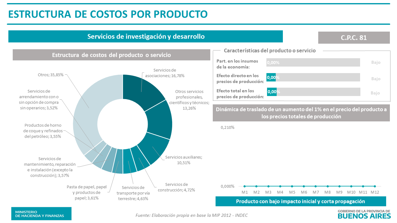 Análisis realizado a partir de la matriz insumo producto nacional para el año 2012, con productos/servicios a dos dígitos de la Clasificación de Productos Central (CPC). Se presenta la estructura de costos de cada producto/servicio y el efecto multiplicar directo y total de un aumento en un 1% en el precio de cada producto/servicio sobre los precios totales de la economía. Ver nota metodológica.