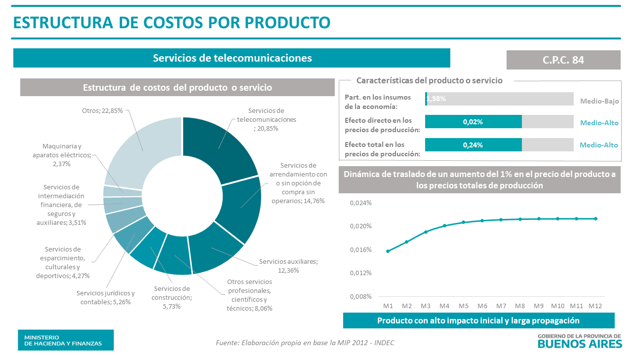 Análisis realizado a partir de la matriz insumo producto nacional para el año 2012, con productos/servicios a dos dígitos de la Clasificación de Productos Central (CPC). Se presenta la estructura de costos de cada producto/servicio y el efecto multiplicar directo y total de un aumento en un 1% en el precio de cada producto/servicio sobre los precios totales de la economía. Ver nota metodológica.