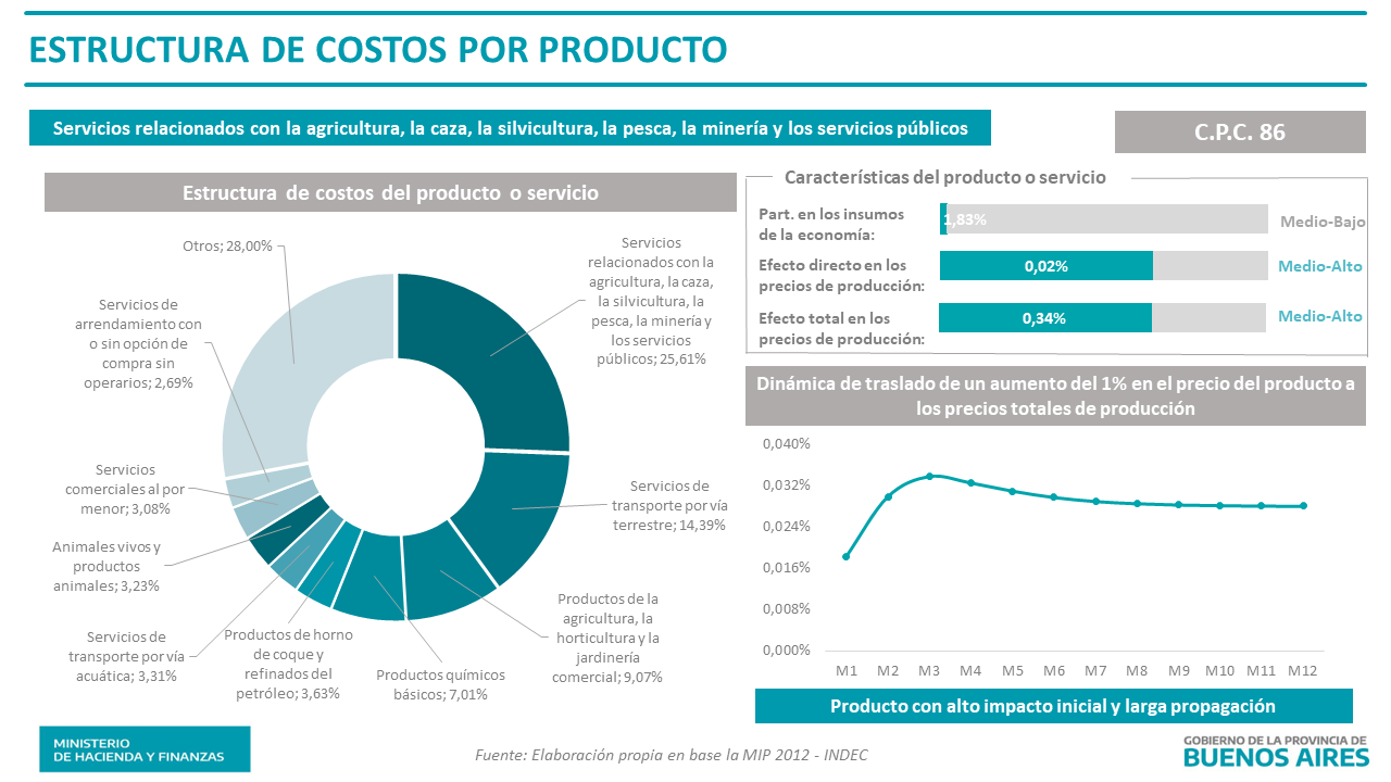Análisis realizado a partir de la matriz insumo producto nacional para el año 2012, con productos/servicios a dos dígitos de la Clasificación de Productos Central (CPC). Se presenta la estructura de costos de cada producto/servicio y el efecto multiplicar directo y total de un aumento en un 1% en el precio de cada producto/servicio sobre los precios totales de la economía. Ver nota metodológica.