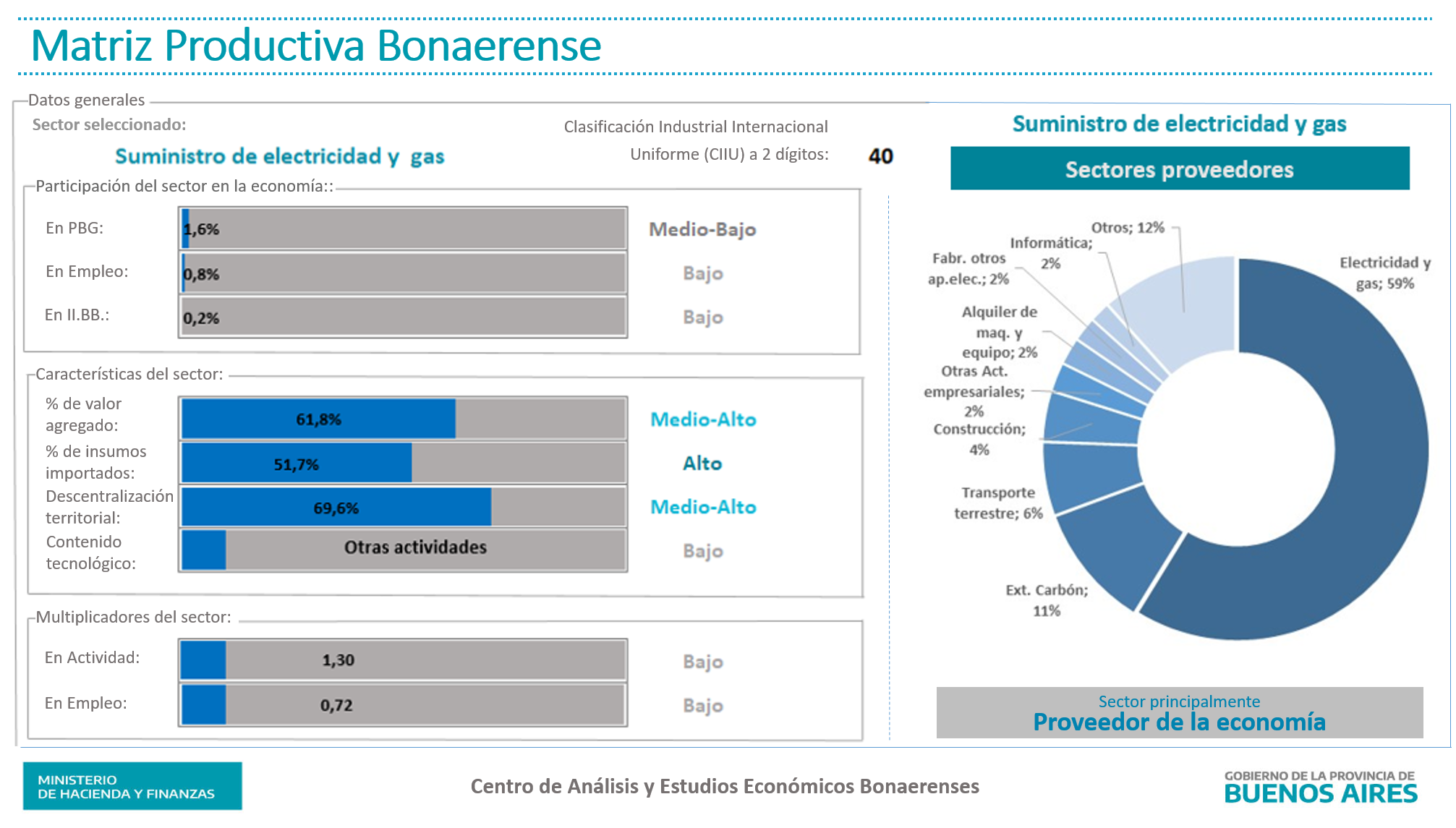 Análisis realizado a partir de la estimación de la matriz insumo producto nacional para el año 2012 y la participación bonaerense en los distintos sectores productivos. La clasificación de cada sector se definió en base a su desempeño en cada indicador respecto del resto de los sectores que conforman la matriz productiva bonaerense. La clasificación tecnológica se realizó en base a la clasificación propuesta por S. Lall. La clasificación del sector según su rol dentro de la economía bonaerense se realizó en base a sus encadenamientos productivos hacia adelante y hacia atrás, respecto del promedio de encadenamientos del total de sectores. Ver nota metodológica.
