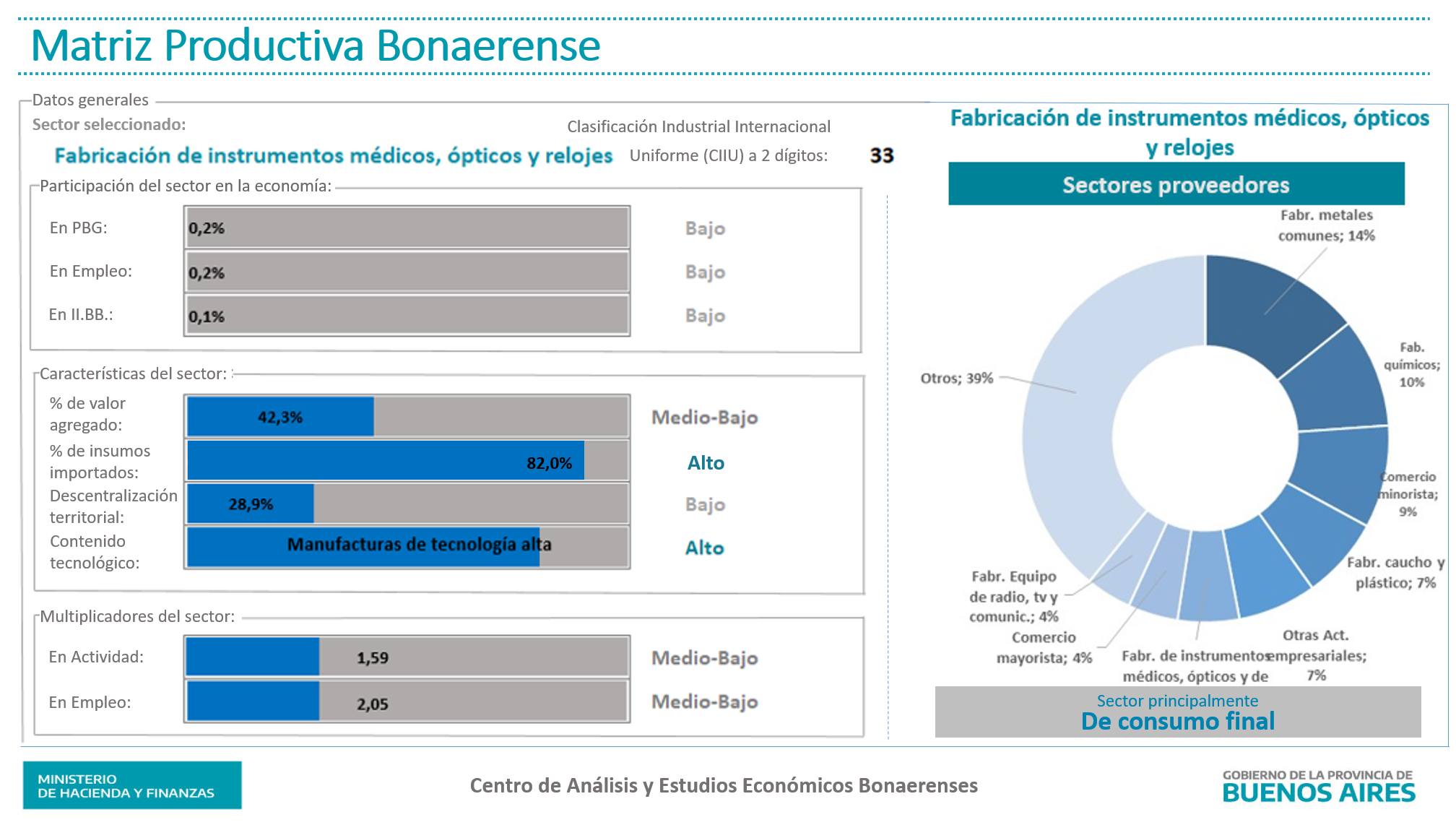 Análisis realizado a partir de la estimación de la matriz insumo producto nacional para el año 2012 y la participación bonaerense en los distintos sectores productivos. La clasificación de cada sector se definió en base a su desempeño en cada indicador respecto del resto de los sectores que conforman la matriz productiva bonaerense. La clasificación tecnológica se realizó en base a la clasificación propuesta por S. Lall. La clasificación del sector según su rol dentro de la economía bonaerense se realizó en base a sus encadenamientos productivos hacia adelante y hacia atrás, respecto del promedio de encadenamientos del total de sectores. Ver nota metodológica.