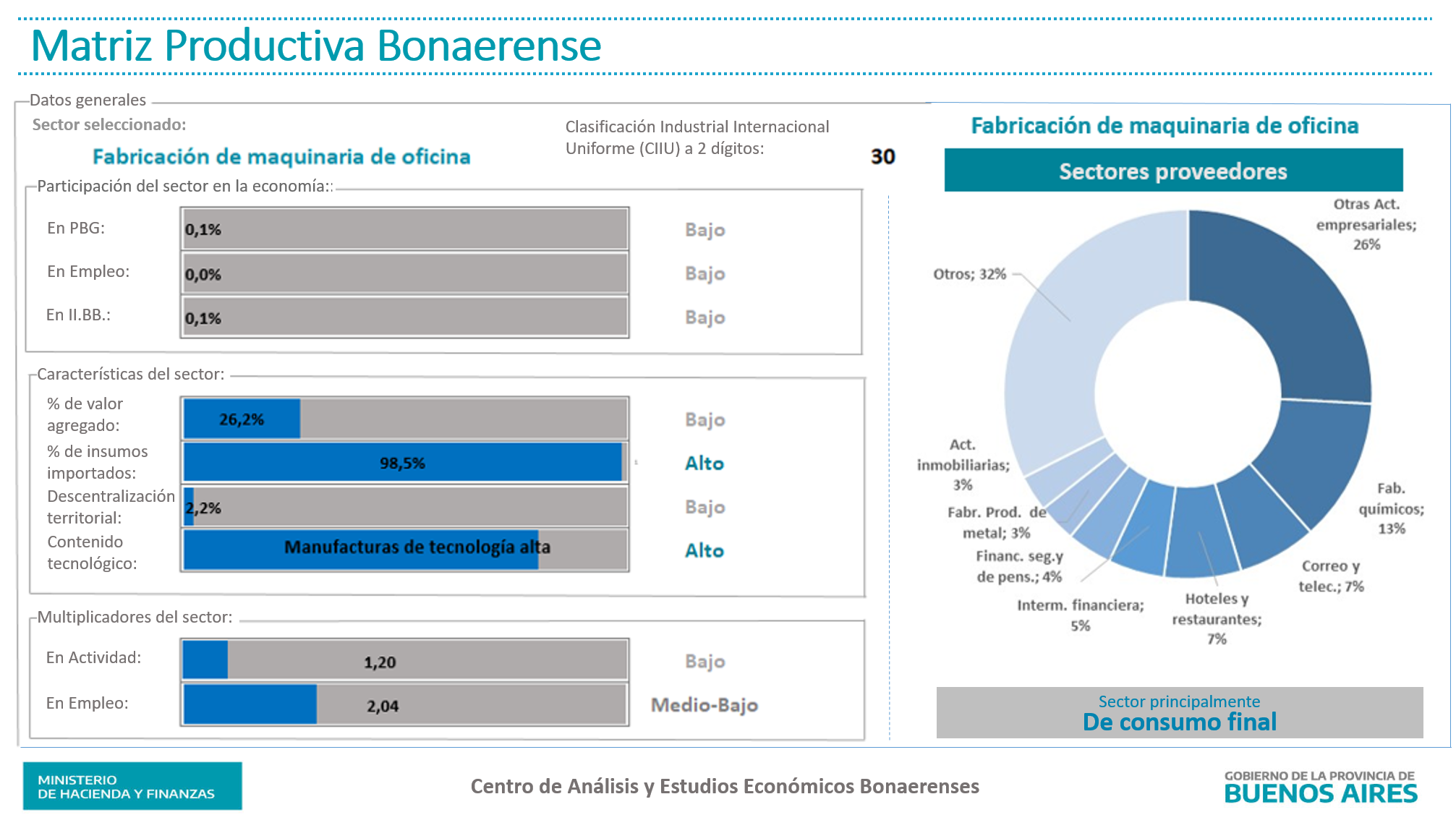 Análisis realizado a partir de la estimación de la matriz insumo producto nacional para el año 2012 y la participación bonaerense en los distintos sectores productivos. La clasificación de cada sector se definió en base a su desempeño en cada indicador respecto del resto de los sectores que conforman la matriz productiva bonaerense. La clasificación tecnológica se realizó en base a la clasificación propuesta por S. Lall. La clasificación del sector según su rol dentro de la economía bonaerense se realizó en base a sus encadenamientos productivos hacia adelante y hacia atrás, respecto del promedio de encadenamientos del total de sectores. Ver nota metodológica.